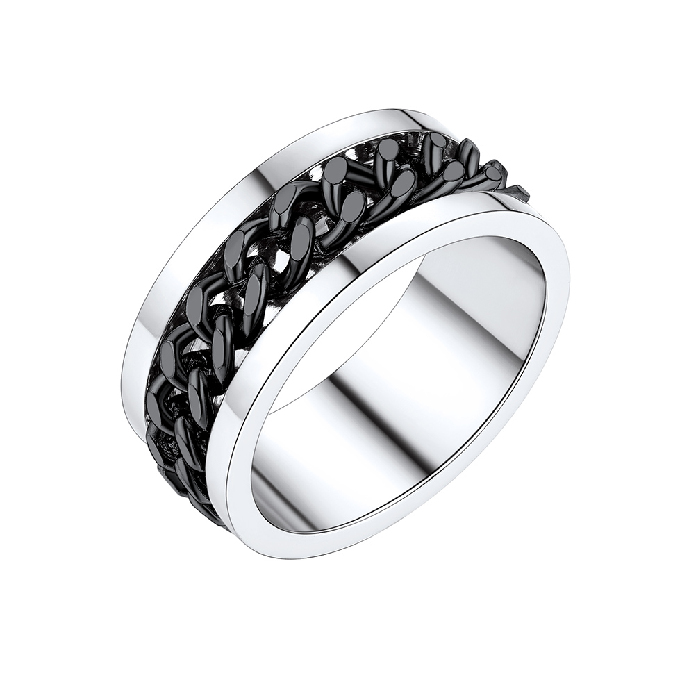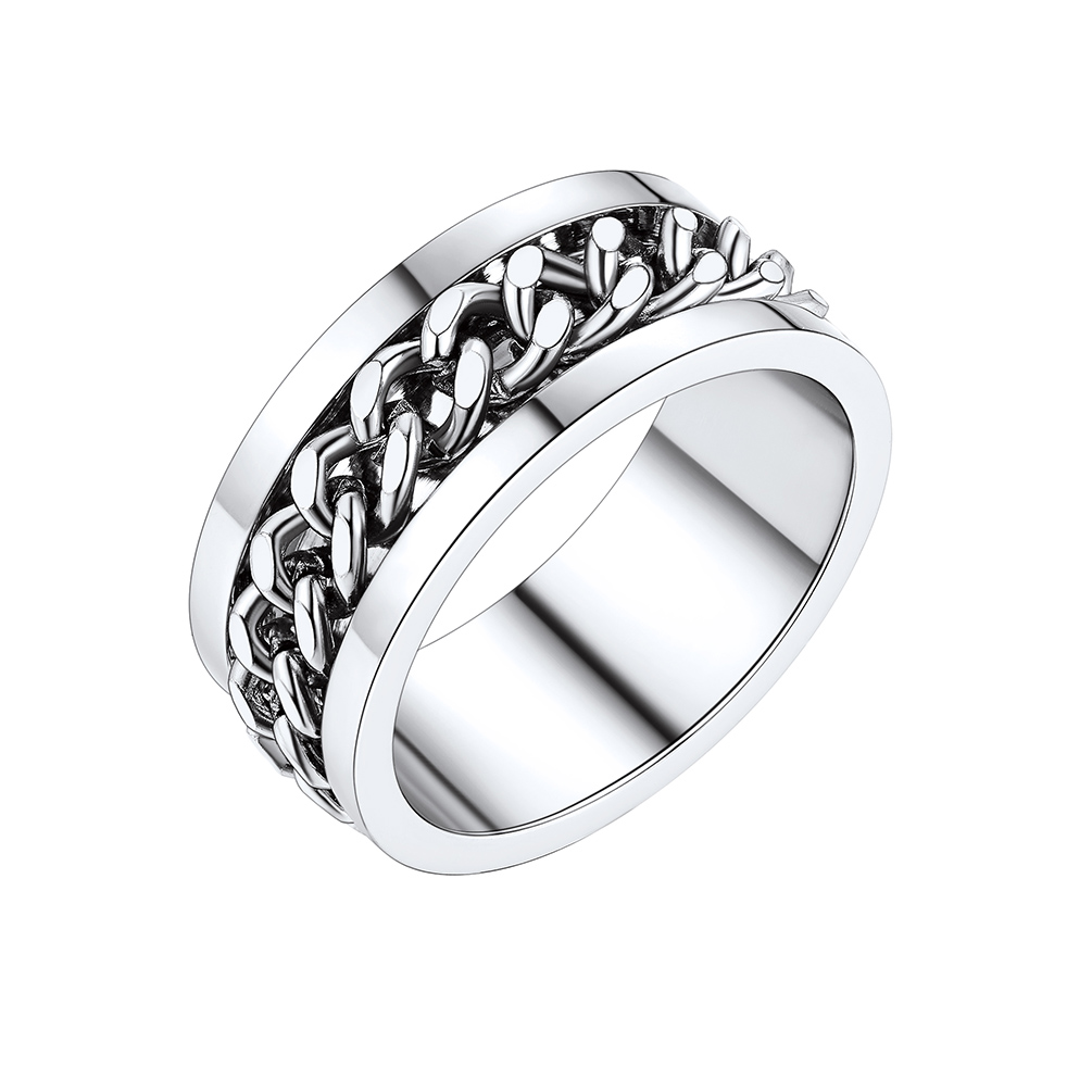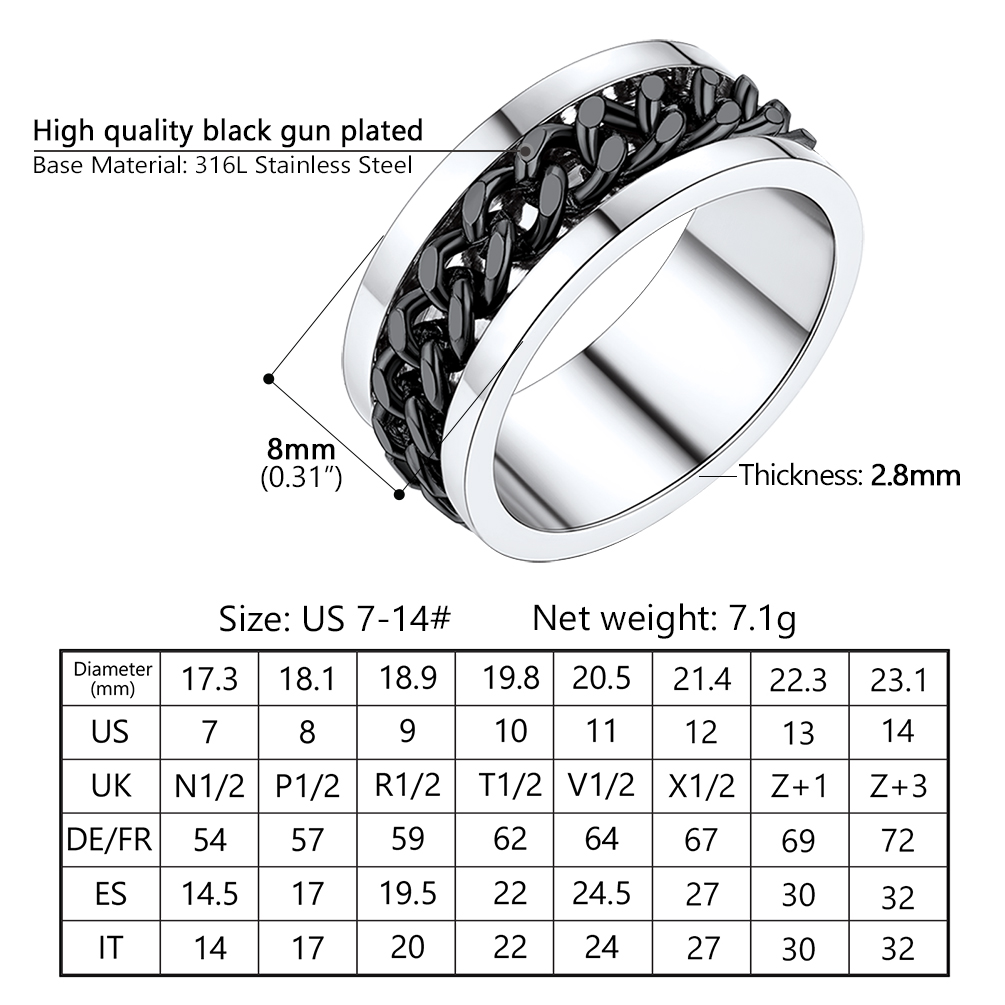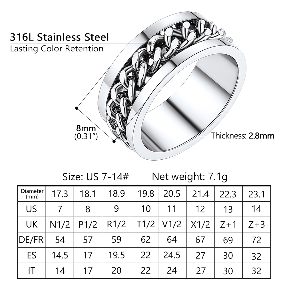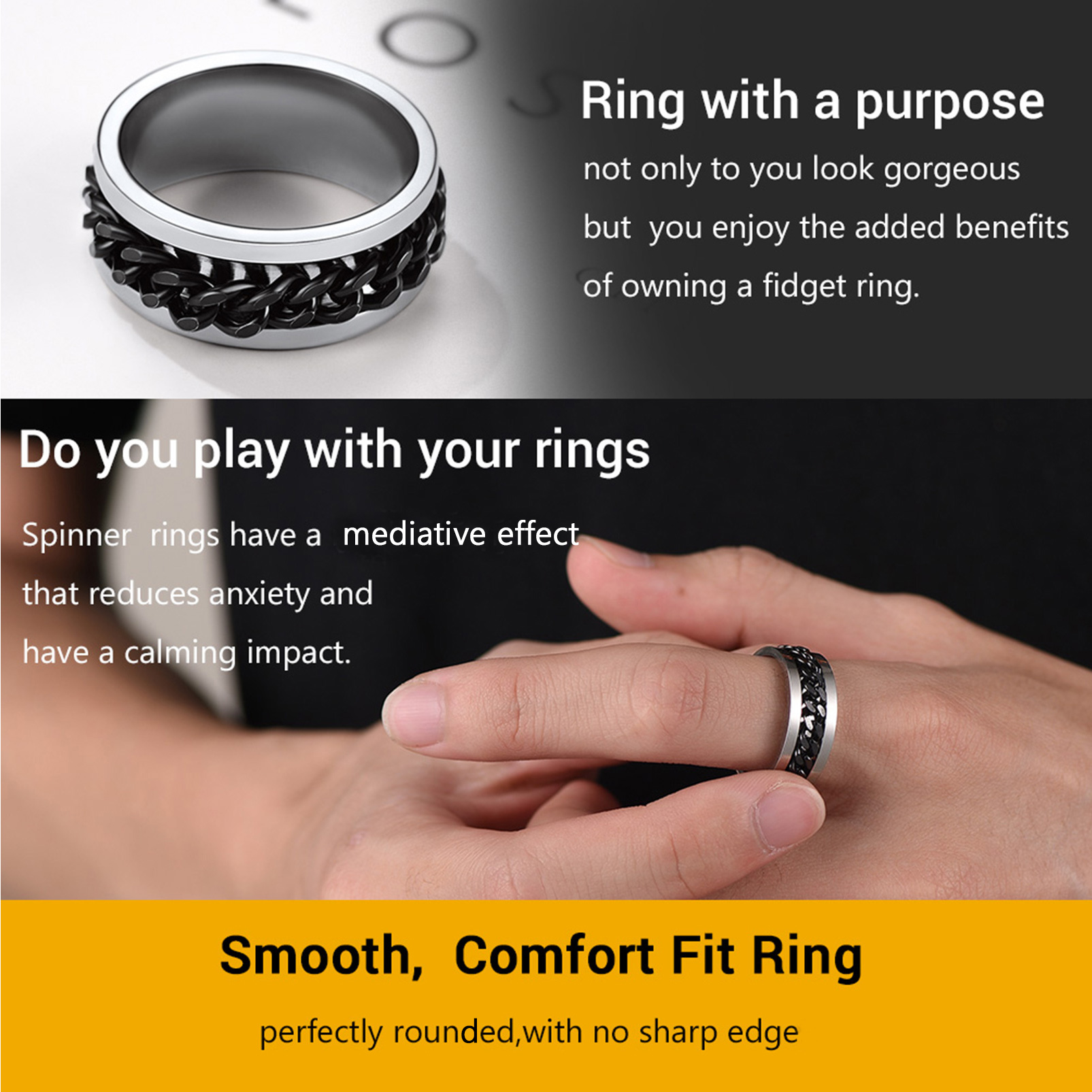 Product Design:Trendy Rings 8MM Wide Size 6 to 14 Available, Multiple Choice. Fidget Ring For Anxiety, Curb Chain Inlaid Design, Which Can Rotates, Excellent If You Have Anxiety Or Get Nervous Frequently. High Polished Inner Face, Smooth and Comfort Fit. Ideal Graduation/Father's Day gift for Him.